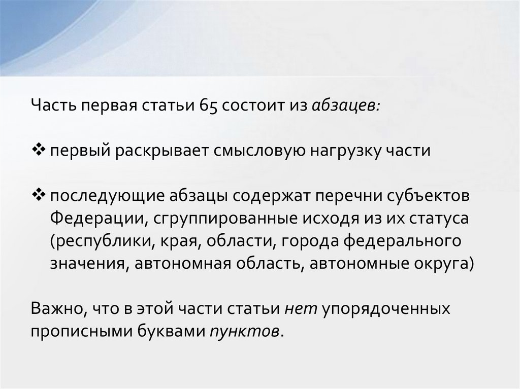 Часть первая статьи 65 состоит из абзацев:первый раскрывает смысловую нагрузку части