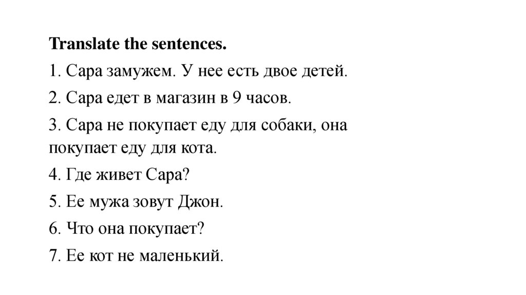 Translate the sentences.1. Сара замужем. У нее есть двое детей.