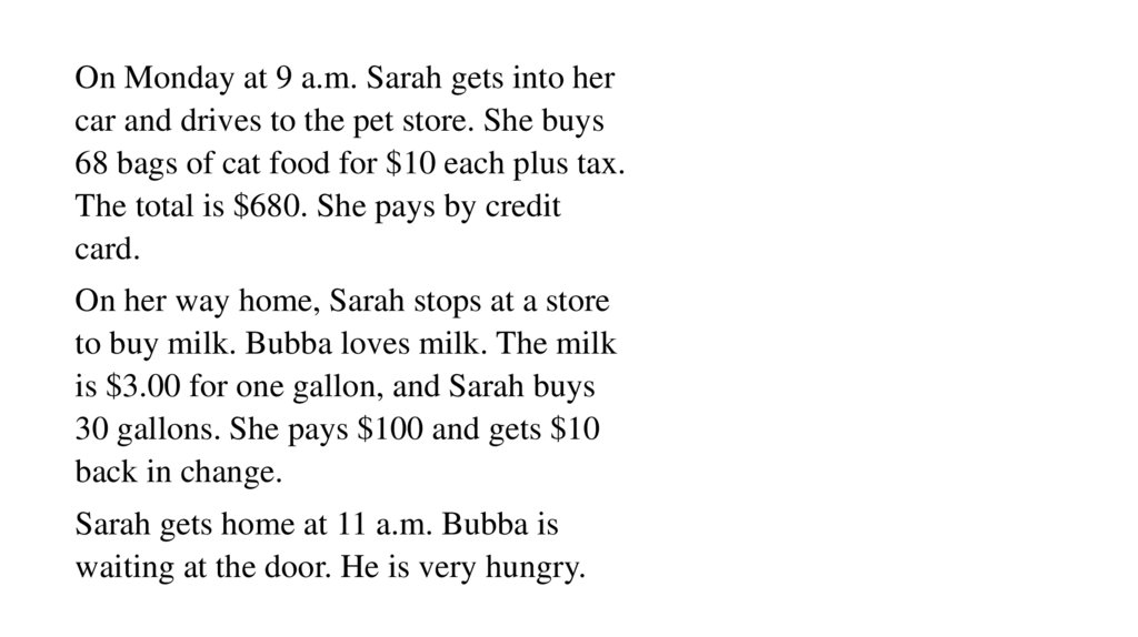 On Monday at 9 a.m. Sarah gets into hercar and drives to the pet store. She buys