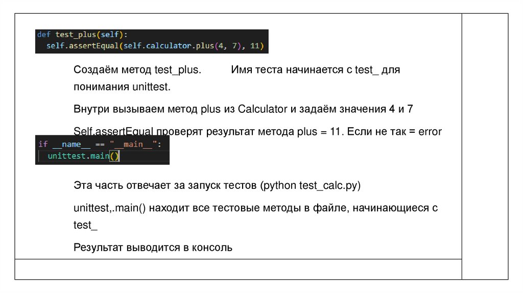 Self.assertEqual проверят результат метода plus = 11. Если не так = error