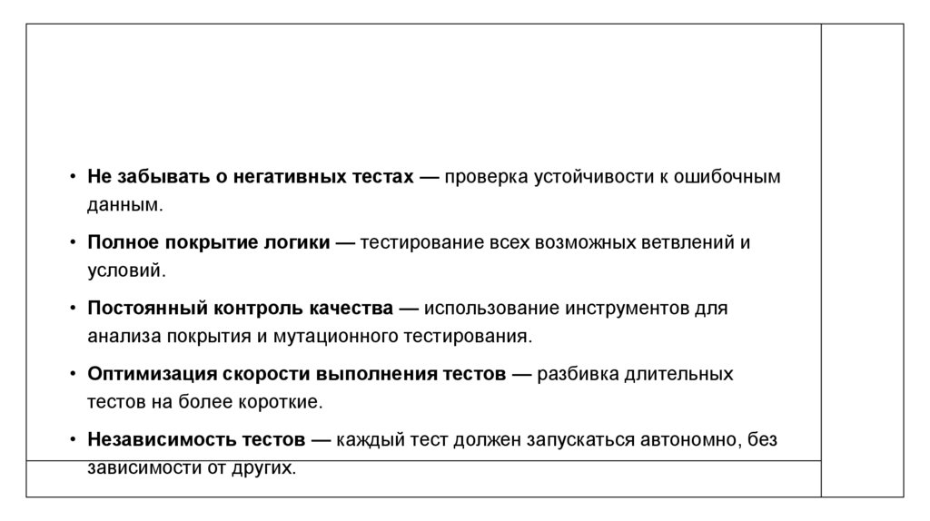 • Не забывать о негативных тестах — проверка устойчивости к ошибочнымданным.