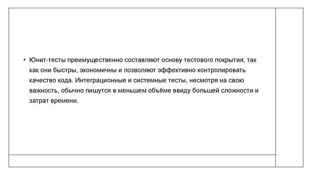 • Юнит-тесты преимущественно составляют основу тестового покрытия, таккак они быстры, экономичны и позволяют эффективно контролировать