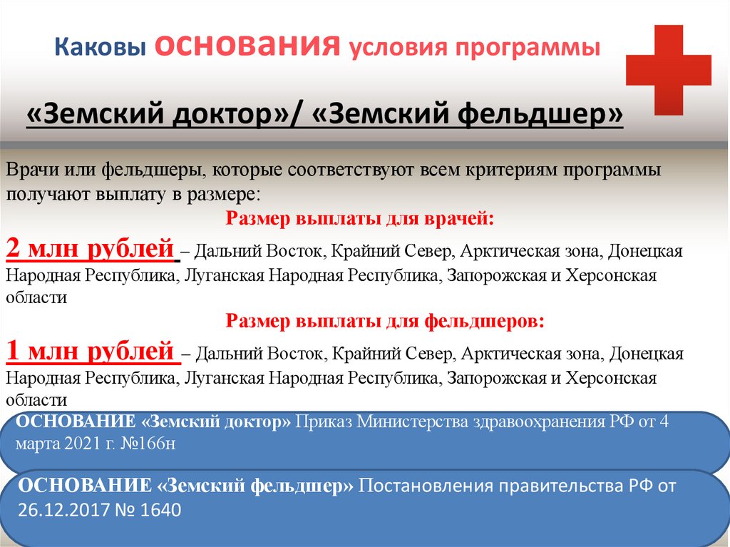 Каковы основания условия программы«Земский доктор»/ «Земский фельдшер»