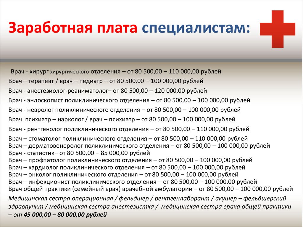Заработная плата специалистам:Врач - хирург хирургического отделения – от 80 500,00 – 110 000,00 рублей