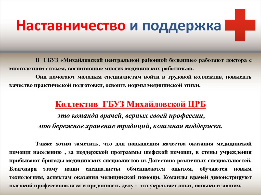 Наставничество и поддержкаВ ГБУЗ «Михайловской центральной районной больнице» работают доктора с