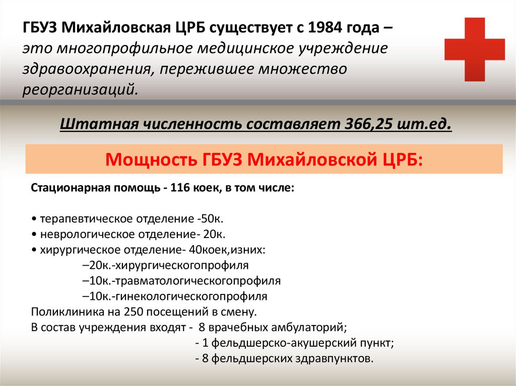 ГБУЗ Михайловская ЦРБ существует с 1984 года –это многопрофильное медицинское учреждение