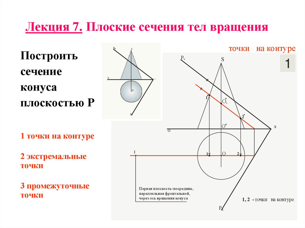 6. Для нахождения промежуточных точек на фронтальной проекции берем дополнительные посредники между экстремальными точками