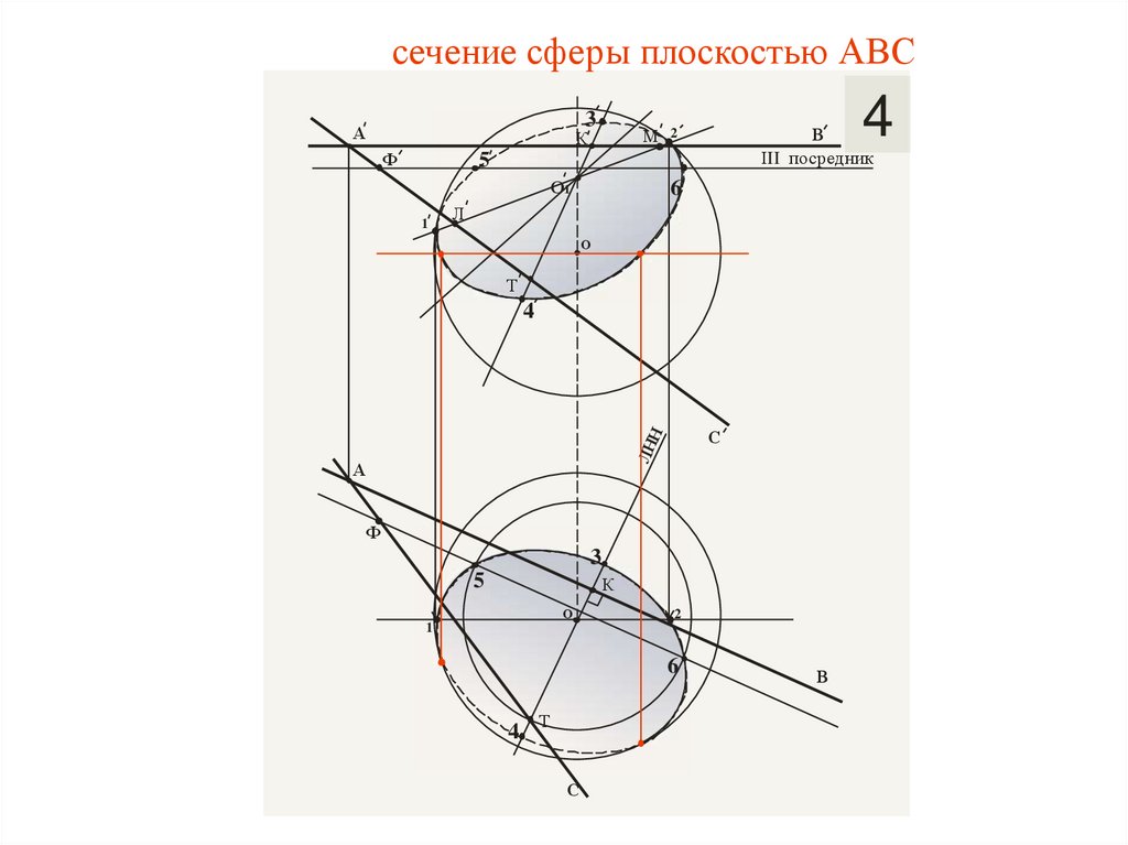 13. Параллельным переносом точки пересечения ЛНН /1/ с контуром сферы переносим на ЛНН