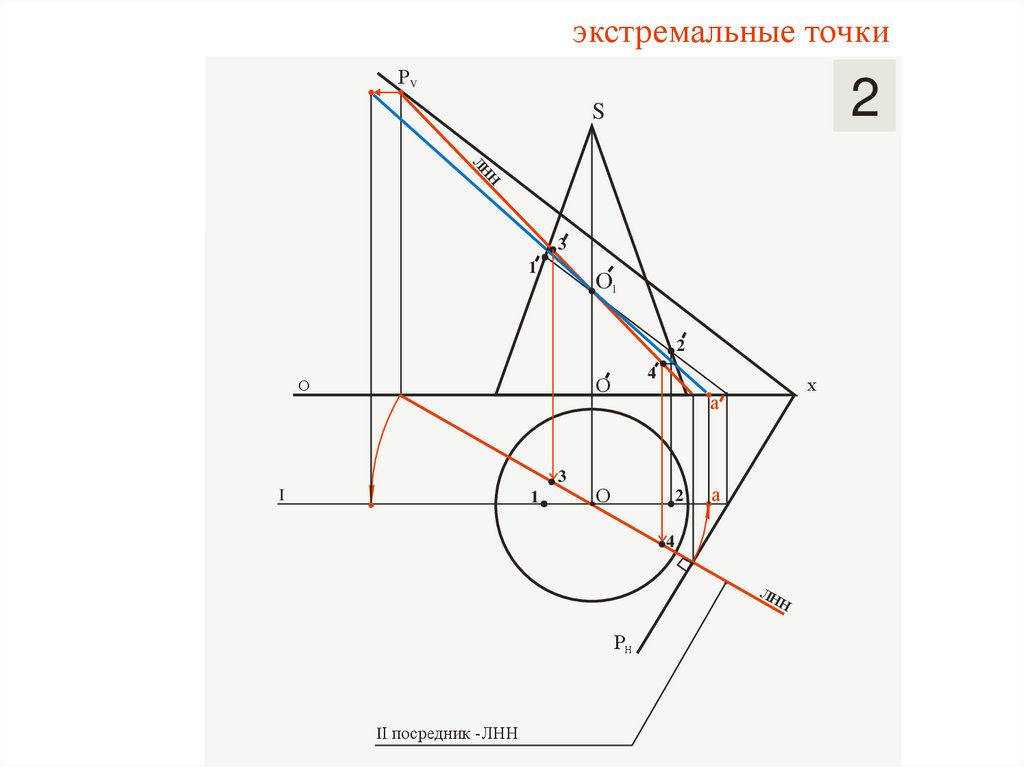 4. Точки пересечения ЛНН /1/ с контуром конуса параллельным переносом переносим на ЛНН