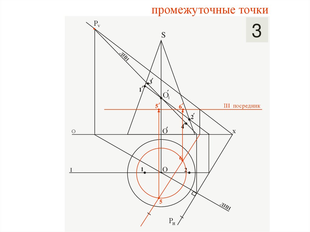 14. Для нахождения промежуточных точек на фронтальной проекции берем дополнительные посредники между экстремальными точками