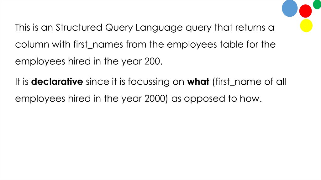 • Declarative paradigm – Programs describe what result is desired, not how to get it.
