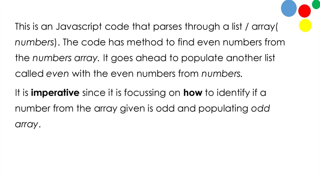 This is an Javascript code that parses through a list / array(numbers). The code has method to find even numbers from
