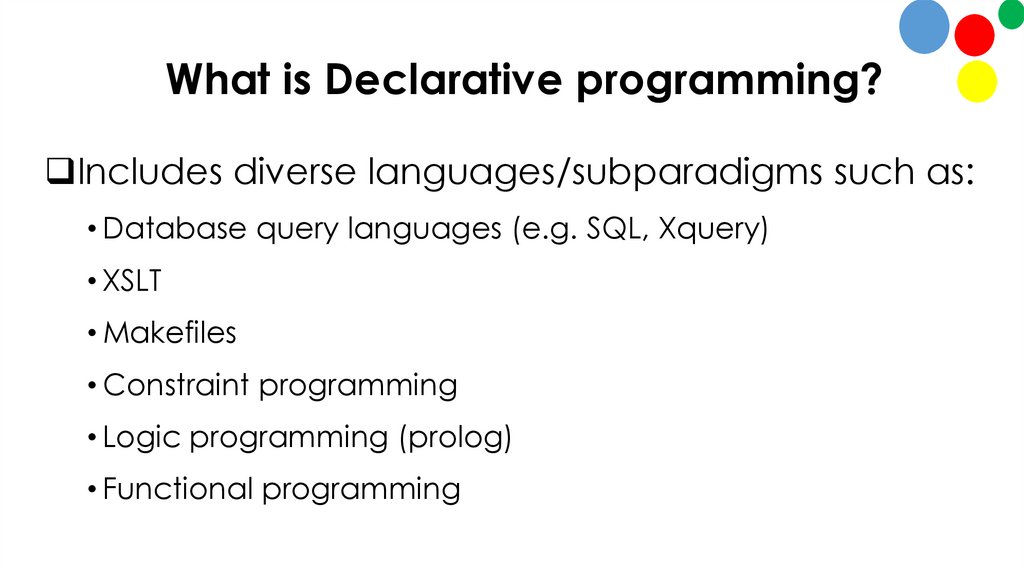 What is Declarative programming?Includes diverse languages/subparadigms such as:
