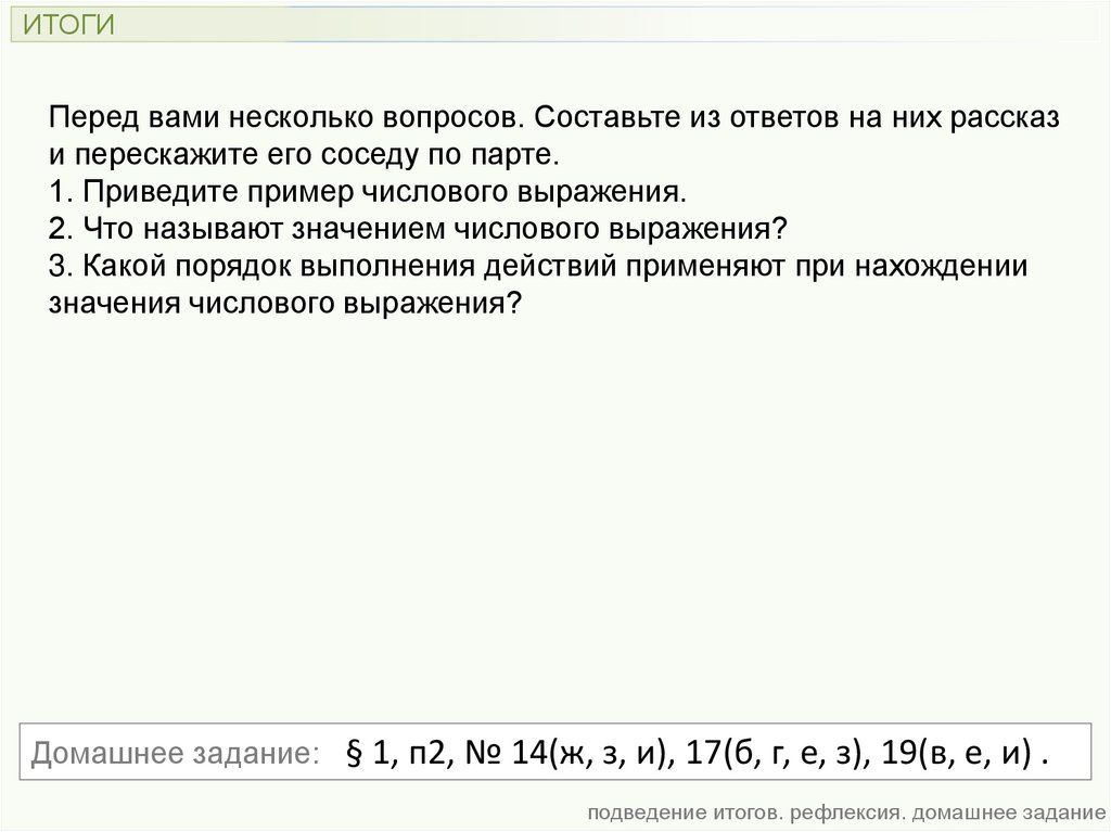 подведение итогов. рефлексия. домашнее задание