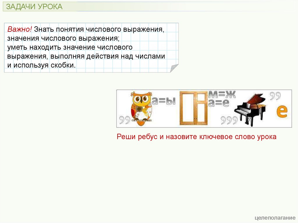 ЗАДАЧИ УРОКАВажно! Знать понятия числового выражения,