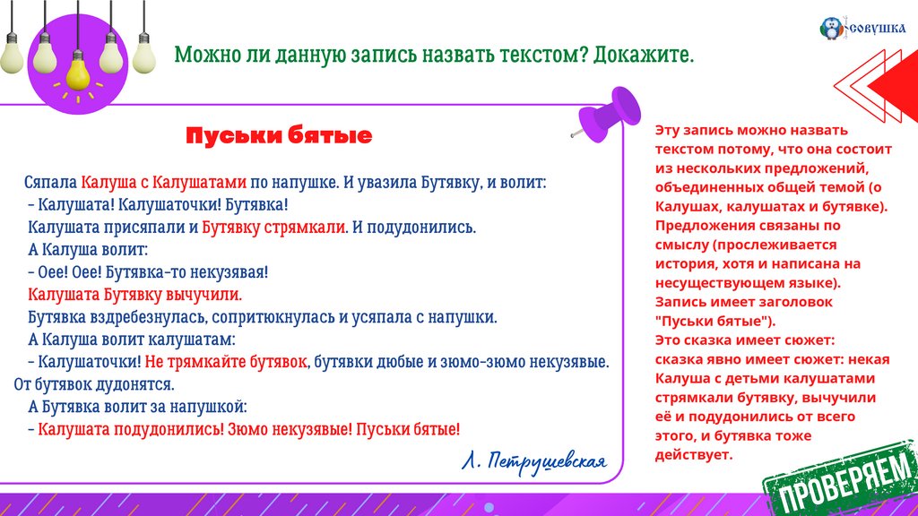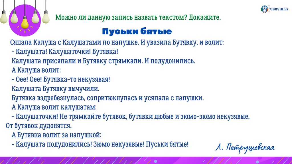 Можно ли данную запись назвать текстом? Докажите.Пуськи бятые