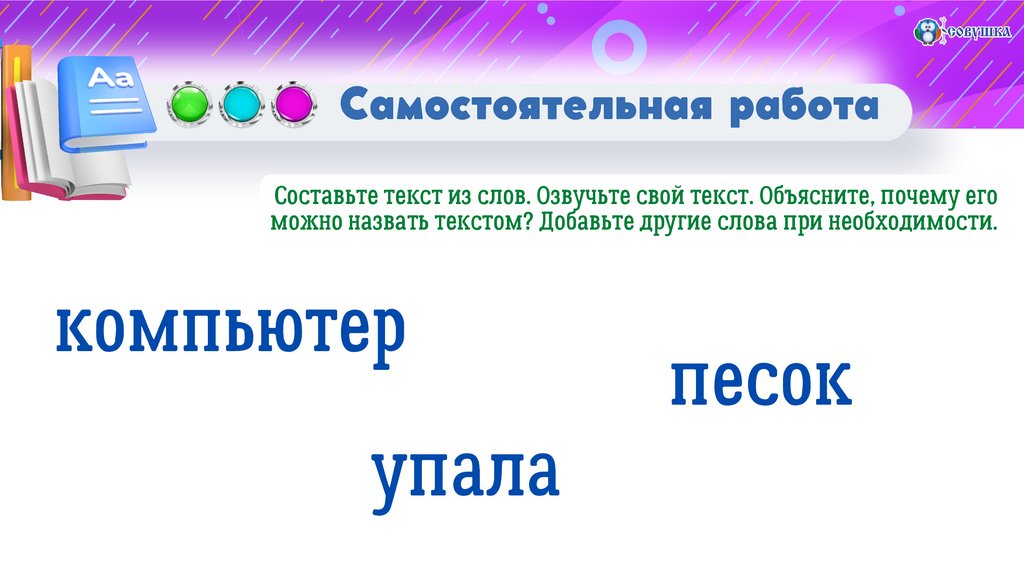 Самостоятельная работаСоставьте текст из слов. Озвучьте свой текст. Объясните, почему его