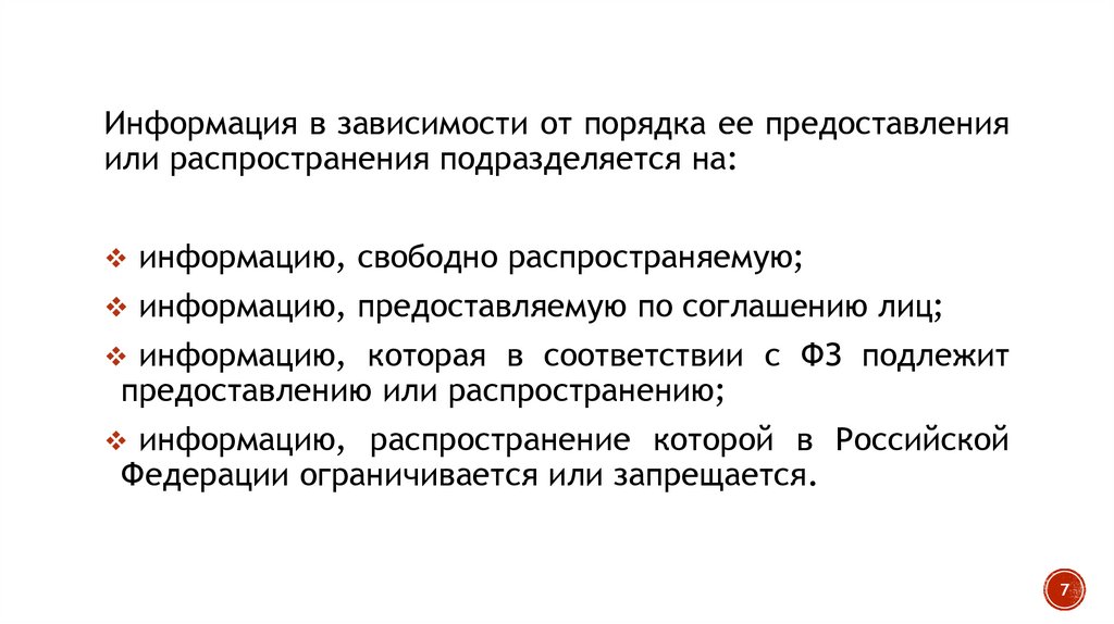 Информация в зависимости от порядка ее предоставленияили распространения подразделяется на: