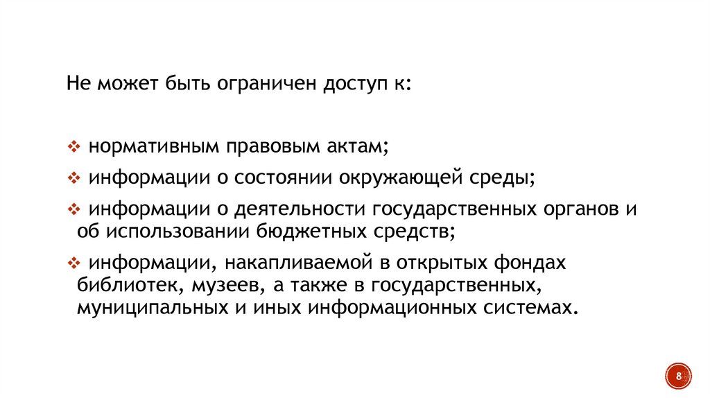Не может быть ограничен доступ к:нормативным правовым актам;