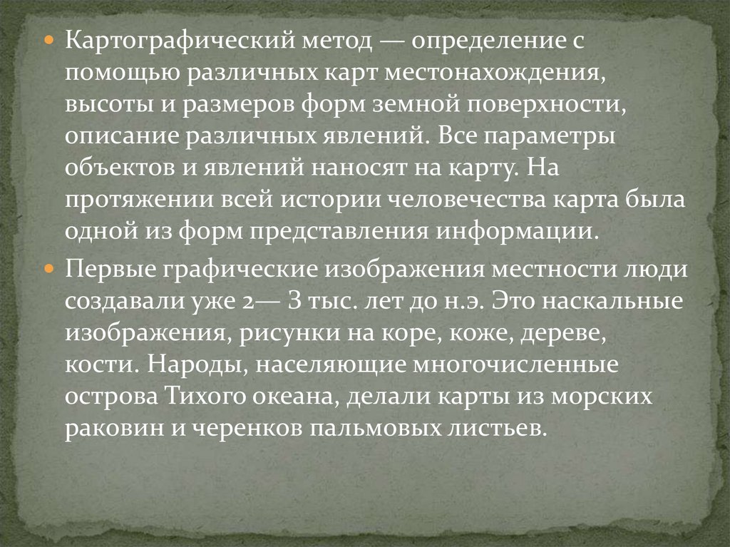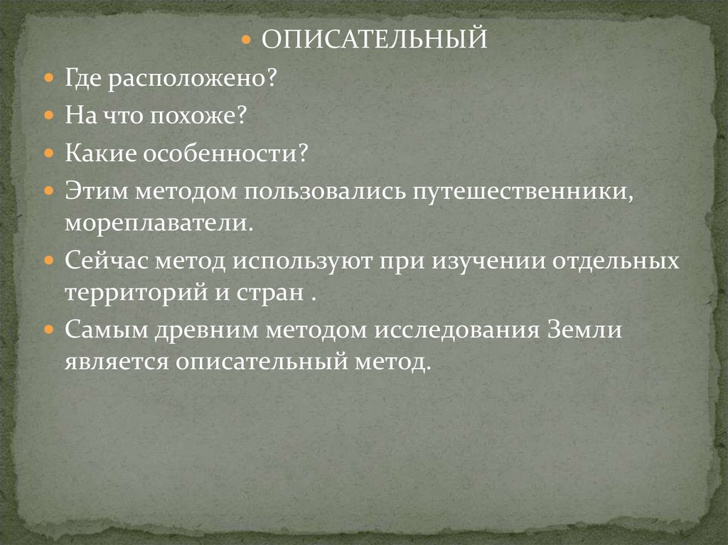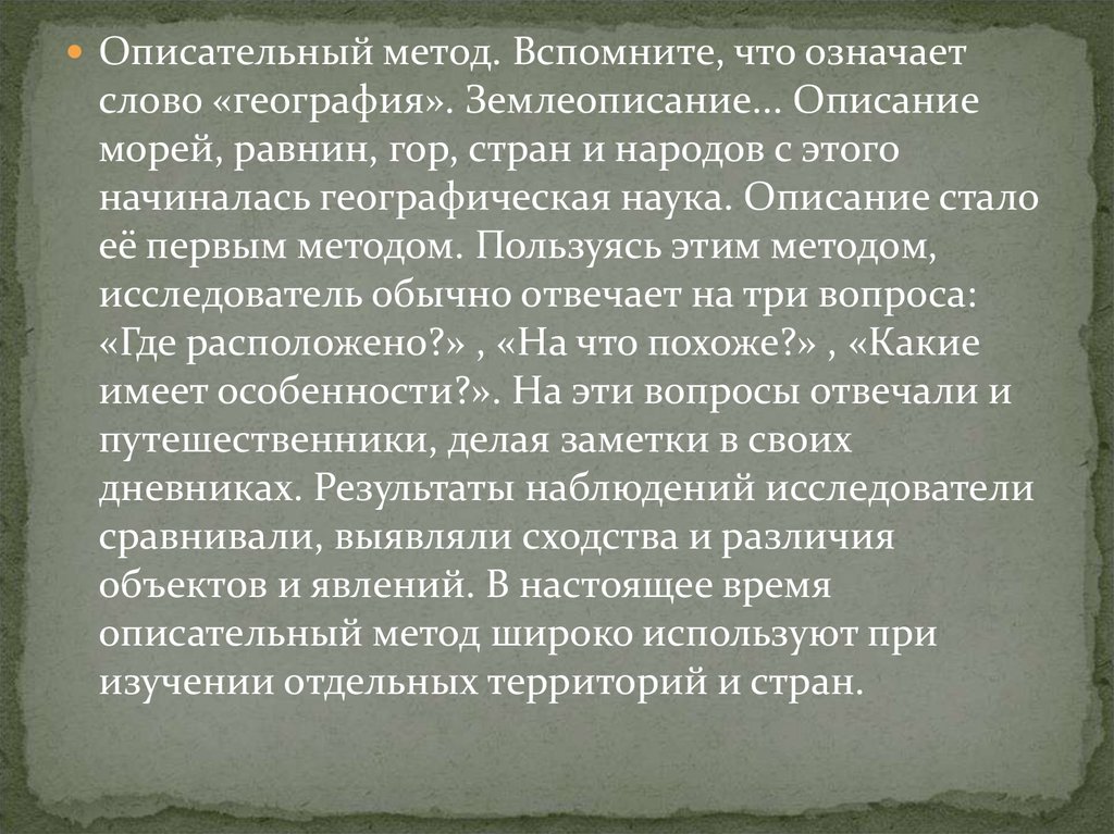 Описательный метод. Вспомните, что означаетслово «география». Землеописание... Описание