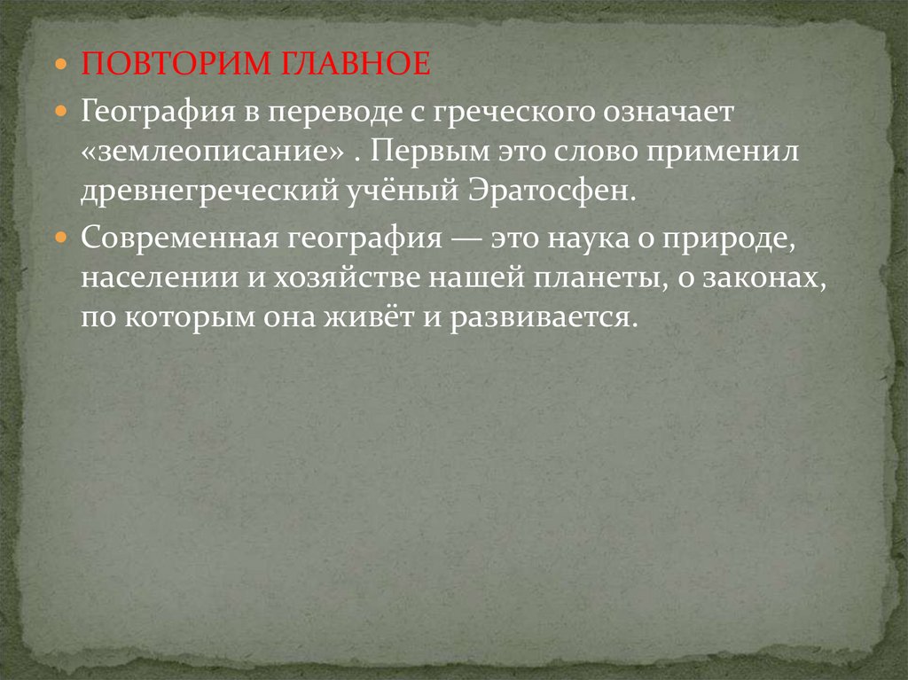 ПОВТОРИМ ГЛАВНОЕГеография в переводе с греческого означает