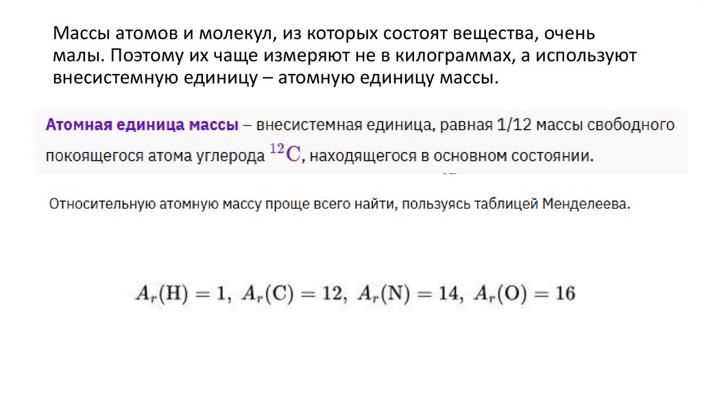 Массы атомов и молекул, из которых состоят вещества, оченьмалы. Поэтому их чаще измеряют не в килограммах, а используют