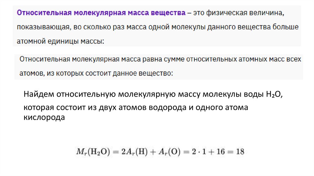 Найдем относительную молекулярную массу молекулы воды H₂O,которая состоит из двух атомов водорода и одного атома