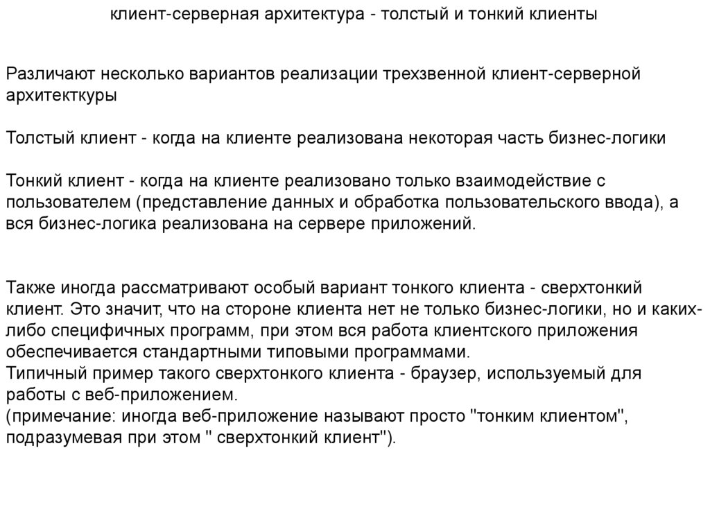 клиент-серверная архитектура - толстый и тонкий клиентыРазличают несколько вариантов реализации трехзвенной клиент-серверной