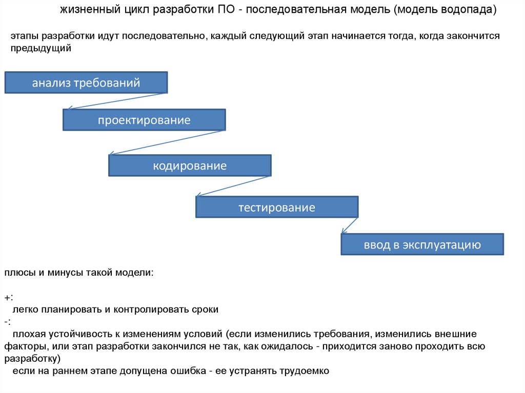 жизненный цикл разработки ПО - последовательная модель (модель водопада)этапы разработки идут последовательно, каждый следующий этап начинается тогда, когда закончится