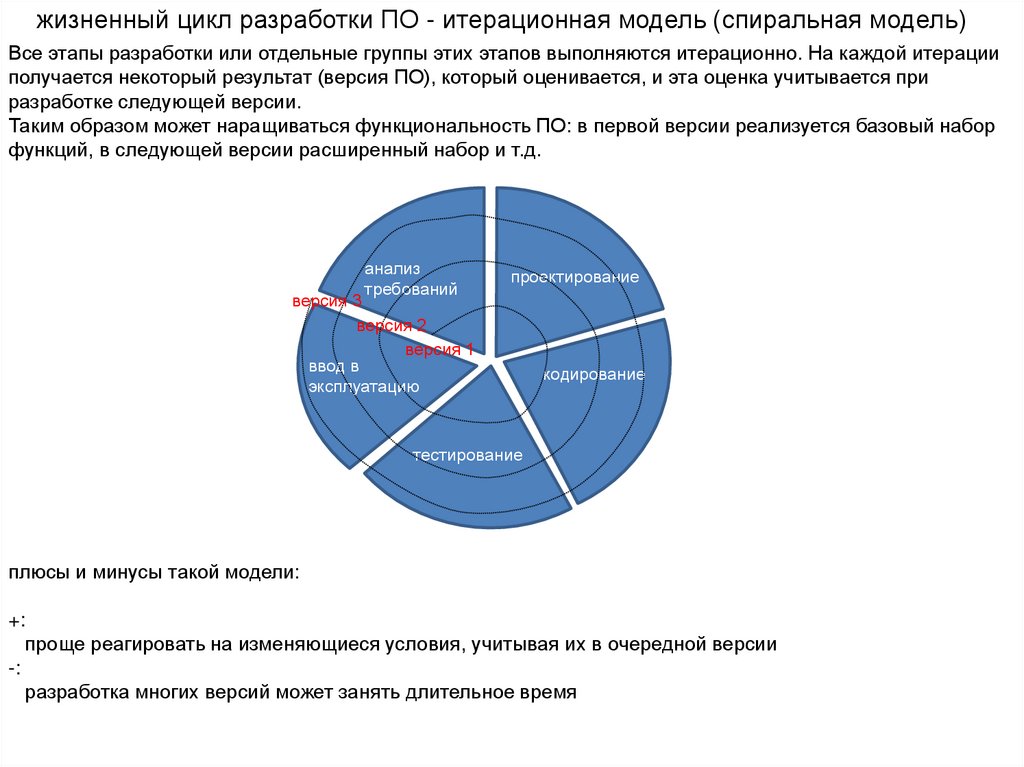 жизненный цикл разработки ПО - итерационная модель (спиральная модель)Все этапы разработки или отдельные группы этих этапов выполняются итерационно. На каждой итерации