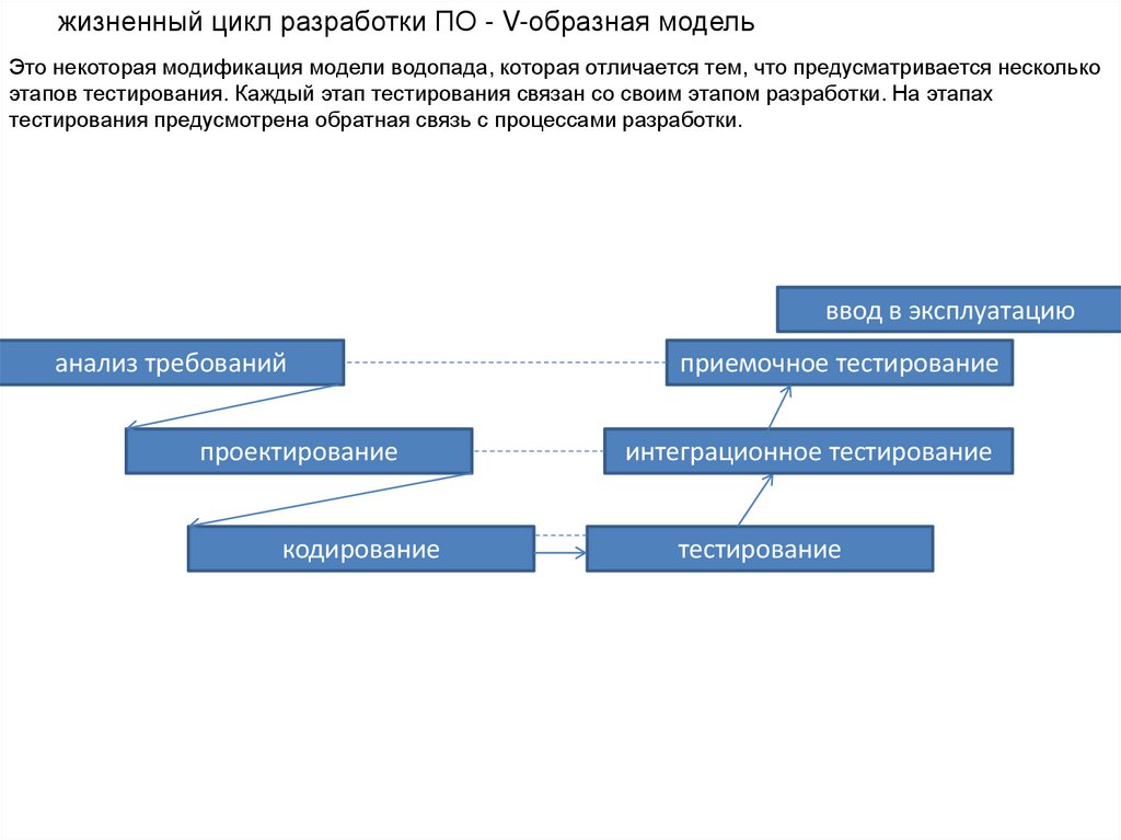 жизненный цикл разработки ПО - V-образная модельЭто некоторая модификация модели водопада, которая отличается тем, что предусматривается несколько