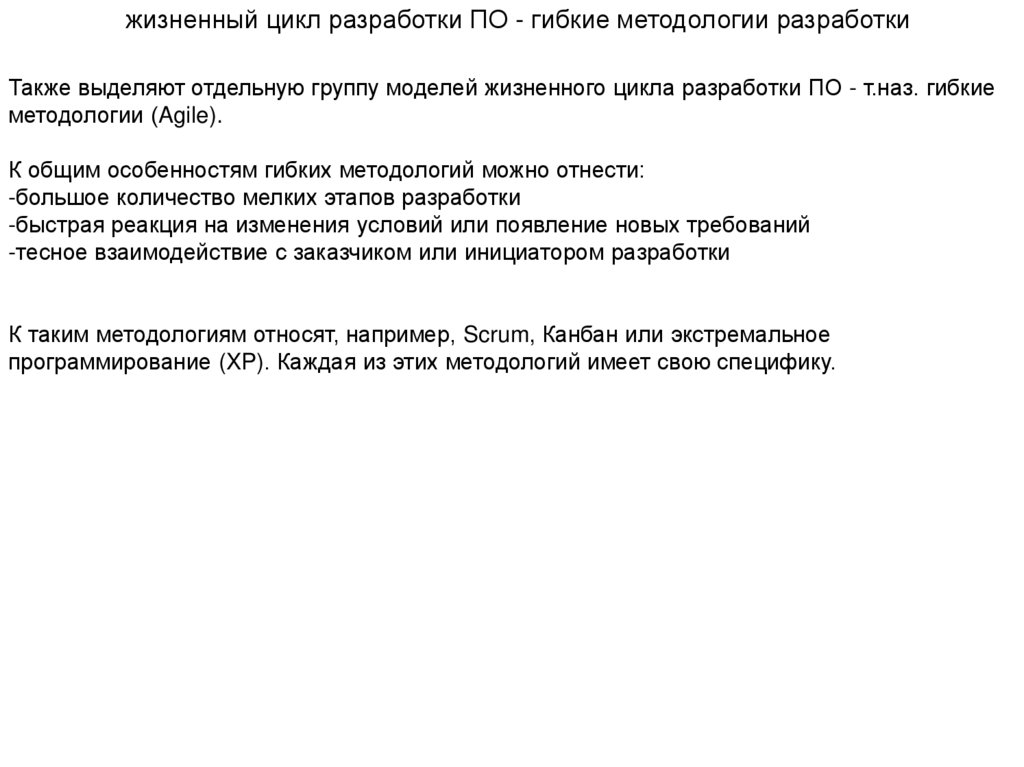 жизненный цикл разработки ПО - гибкие методологии разработкиТакже выделяют отдельную группу моделей жизненного цикла разработки ПО - т.наз. гибкие