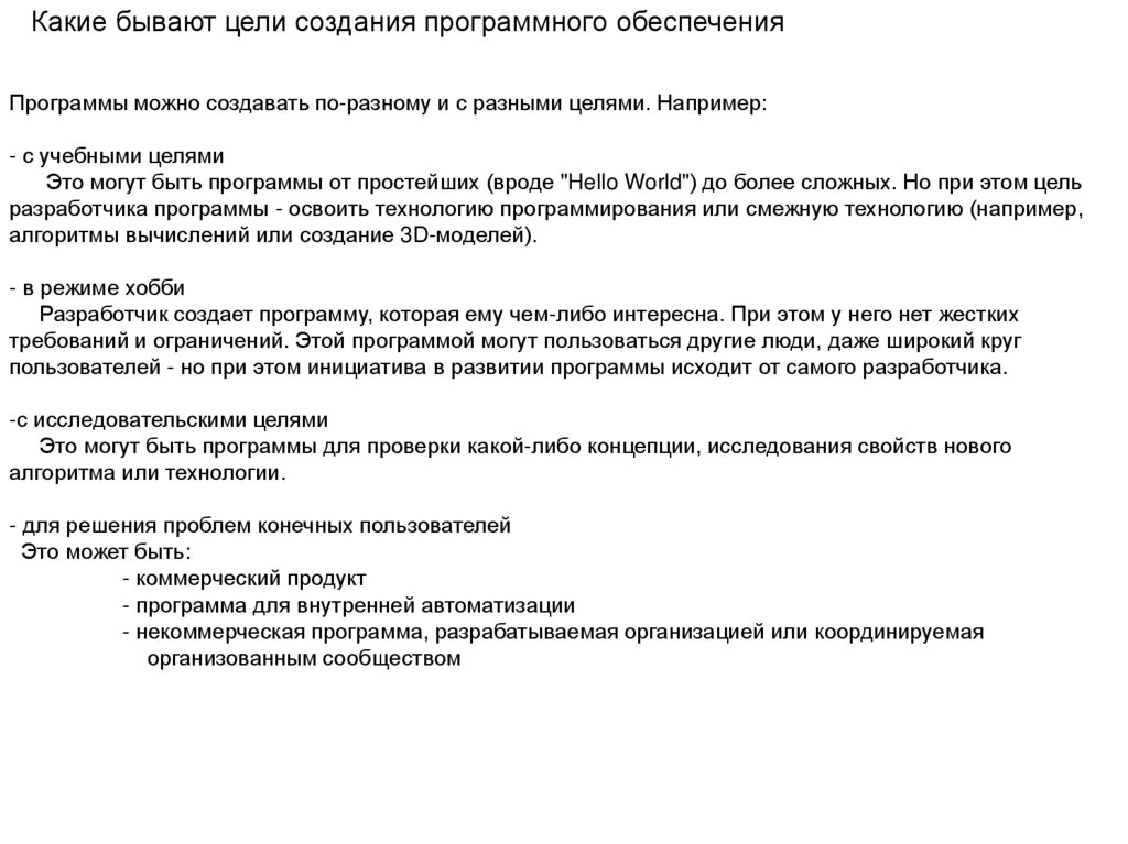 Какие бывают цели создания программного обеспеченияПрограммы можно создавать по-разному и с разными целями. Например: