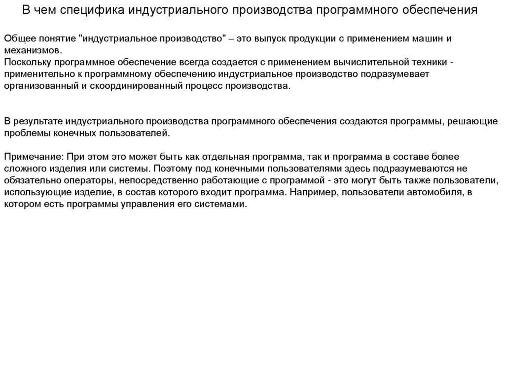 В чем специфика индустриального производства программного обеспеченияОбщее понятие "индустриальное производство" – это выпуск продукции с применением машин и