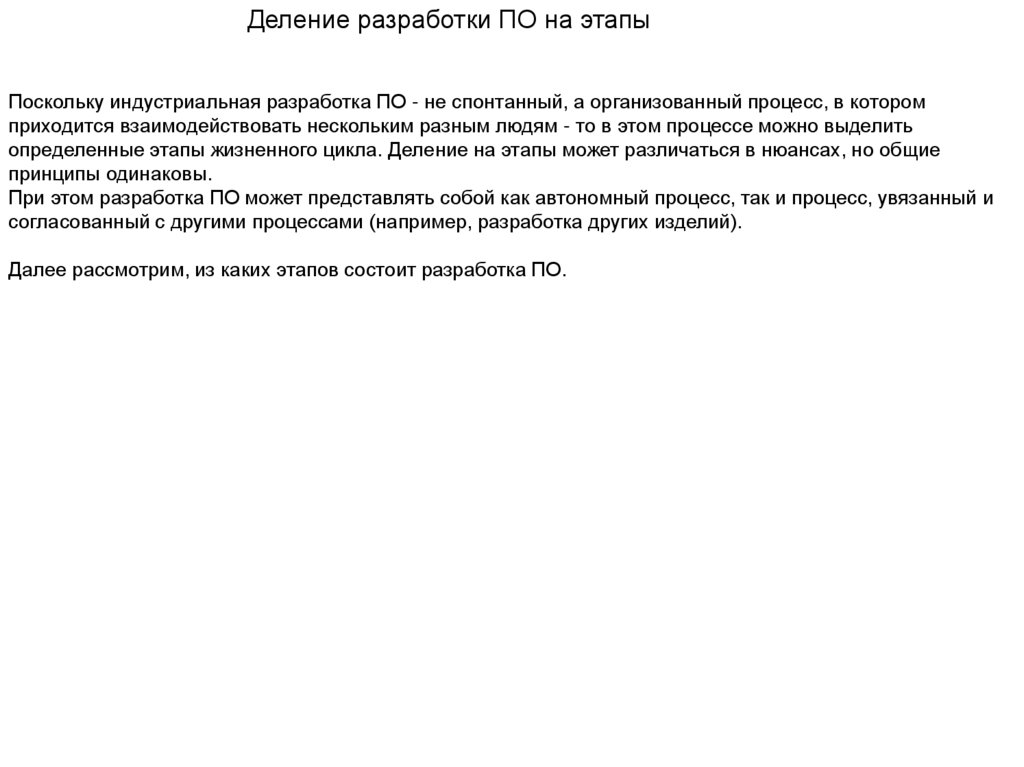 Деление разработки ПО на этапыПоскольку индустриальная разработка ПО - не спонтанный, а организованный процесс, в котором
