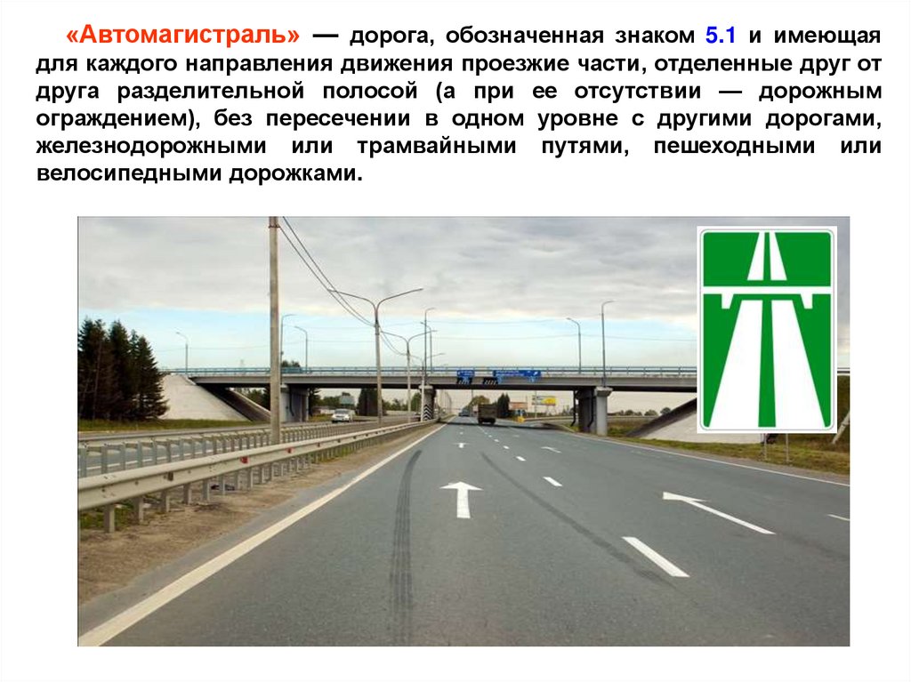 «Автомагистраль» — дорога, обозначенная знаком 5.1 и имеющаядля каждого направления движения проезжие части, отделенные друг от