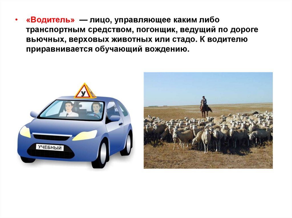 • «Водитель» — лицо, управляющее каким либотранспортным средством, погонщик, ведущий по дороге