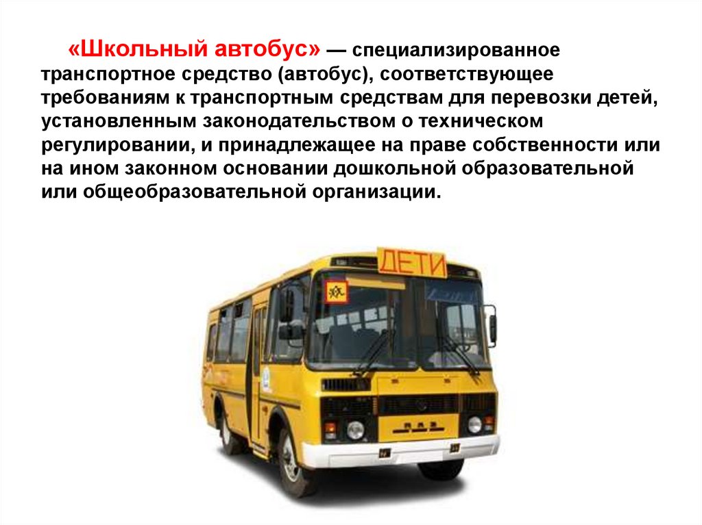 «Школьный автобус» — специализированноетранспортное средство (автобус), соответствующее