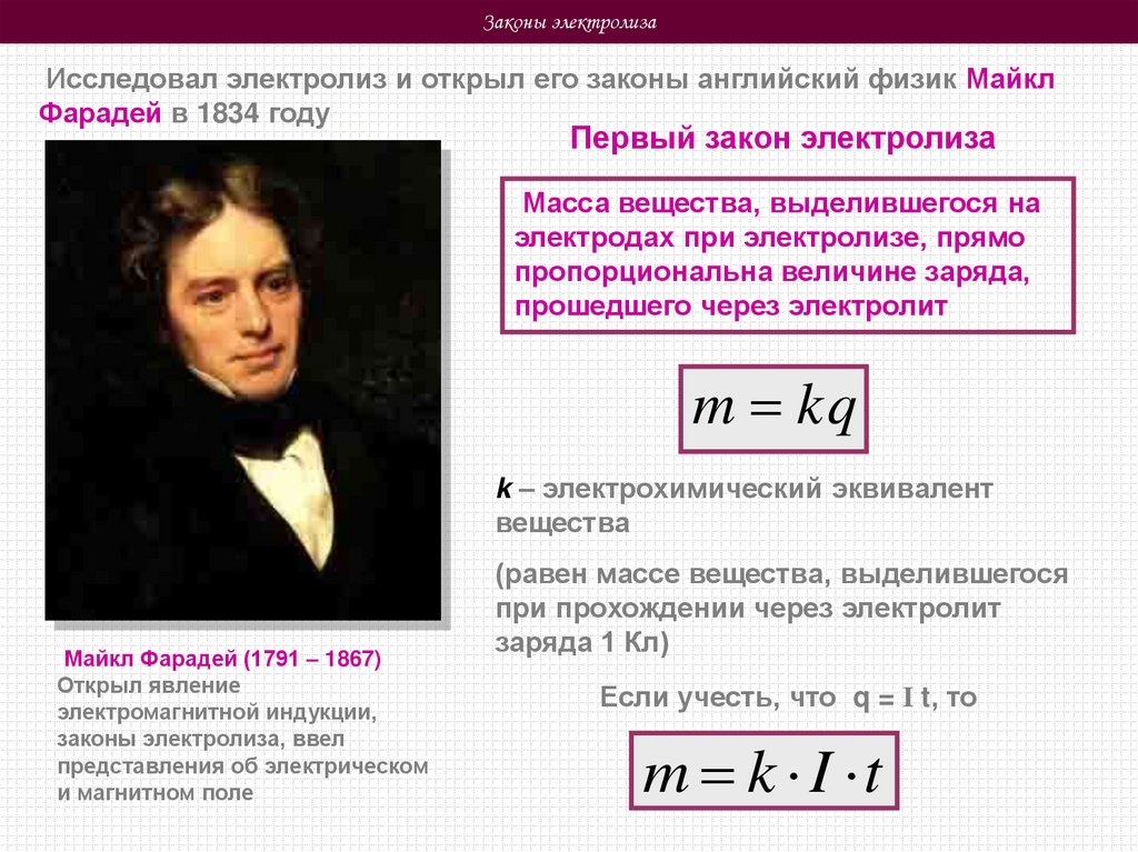 Законы электролизаИсследовал электролиз и открыл его законы английский физик Майкл