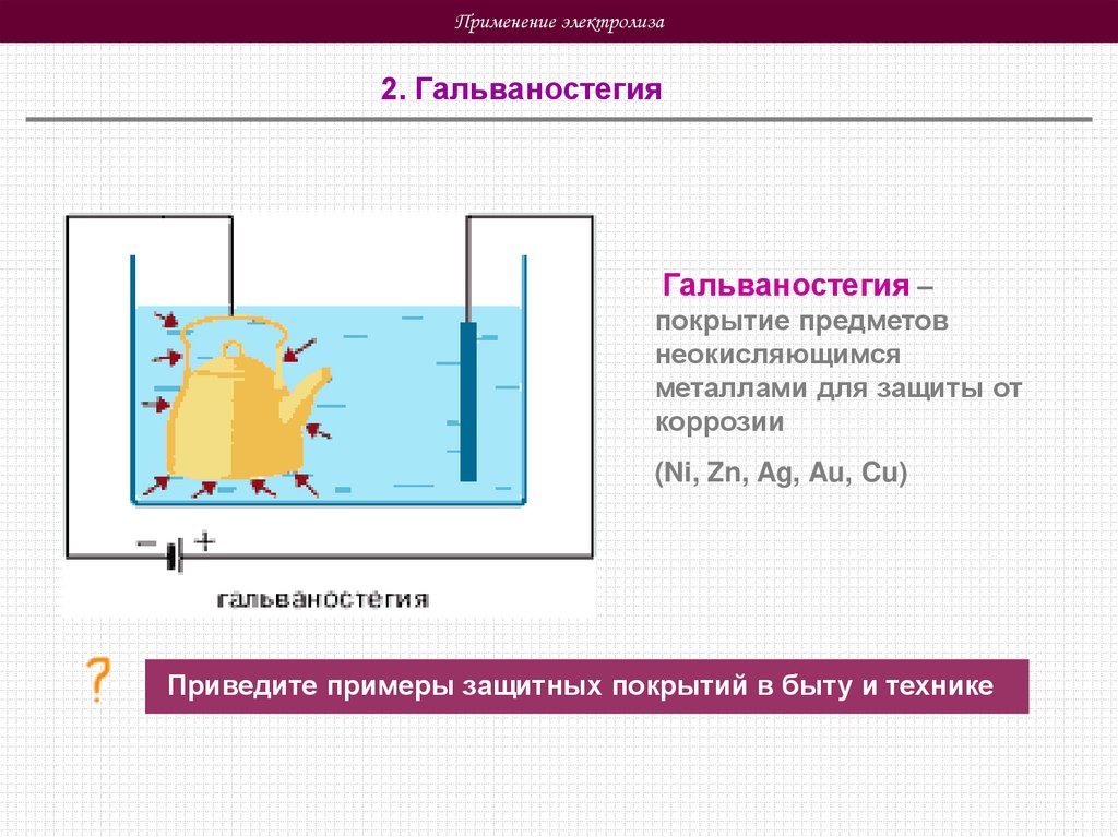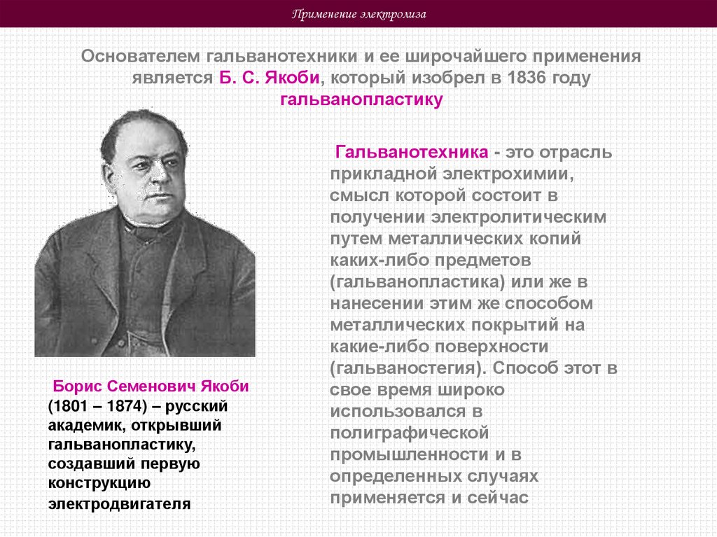 Применение электролизаОснователем гальванотехники и ее широчайшего применения