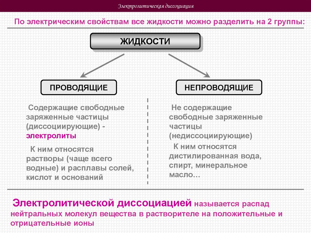 Электролитическая диссоциацияПо электрическим свойствам все жидкости можно разделить на 2 группы: