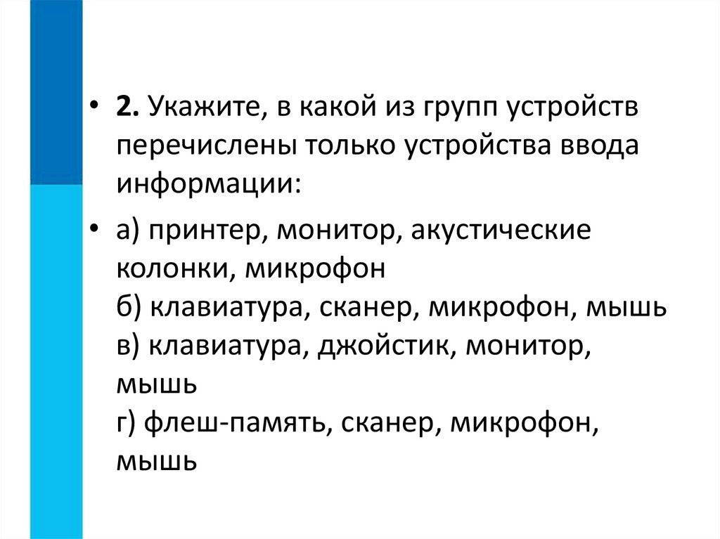 • 2. Укажите, в какой из групп устройствперечислены только устройства ввода