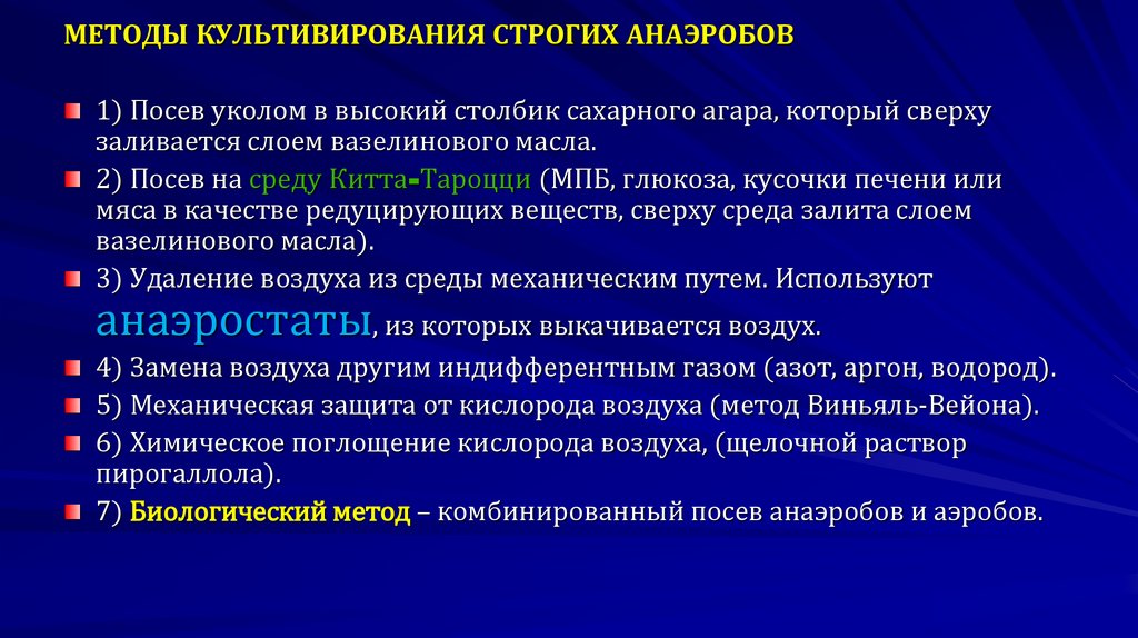 МЕТОДЫ КУЛЬТИВИРОВАНИЯ СТРОГИХ АНАЭРОБОВ1) Посев уколом в высокий столбик сахарного агара, который сверху