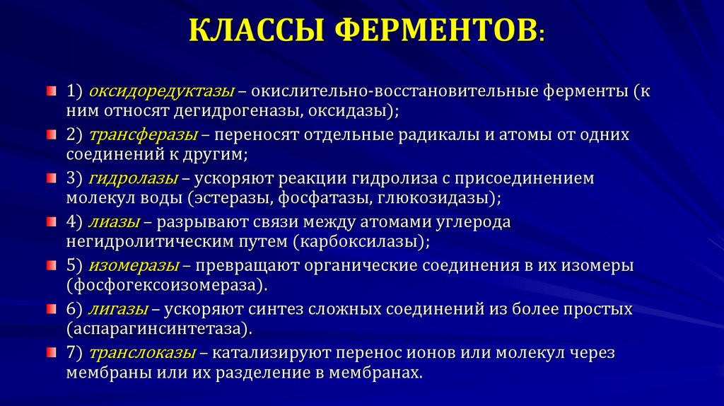 КЛАССЫ ФЕРМЕНТОВ:1) оксидоредуктазы – окислительно-восстановительные ферменты (к