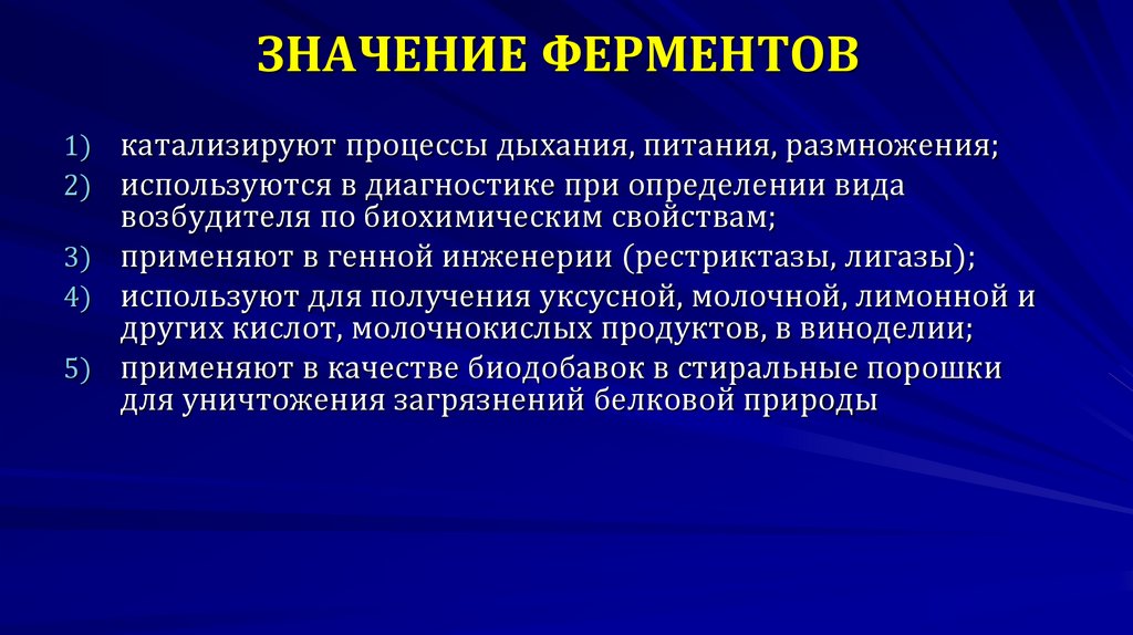 ЗНАЧЕНИЕ ФЕРМЕНТОВ1) катализируют процессы дыхания, питания, размножения;