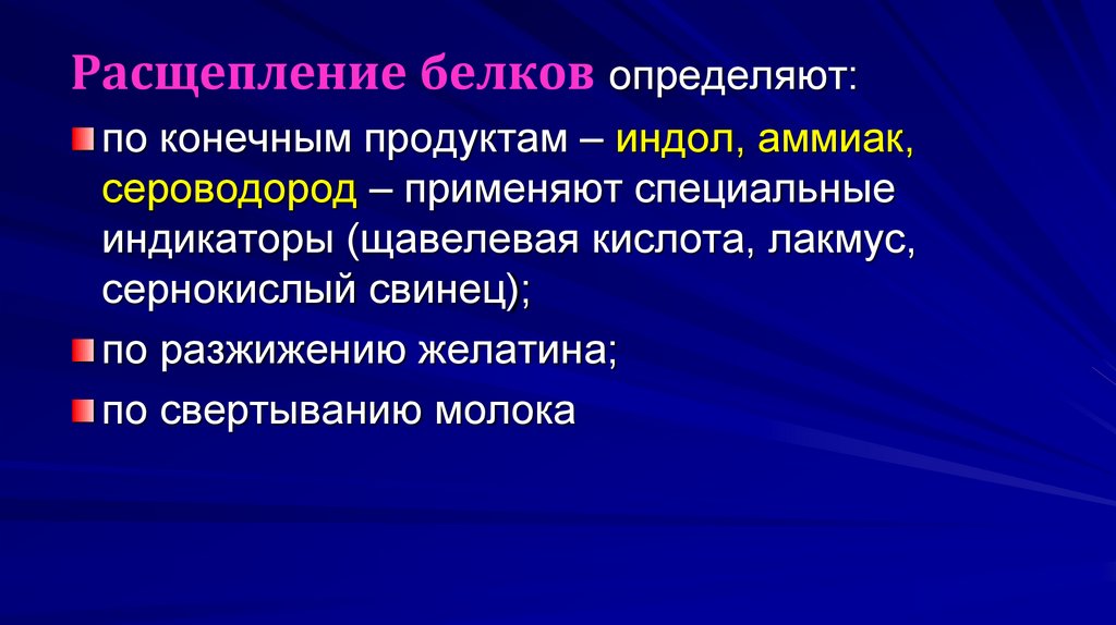 Расщепление белков определяют:по конечным продуктам – индол, аммиак,