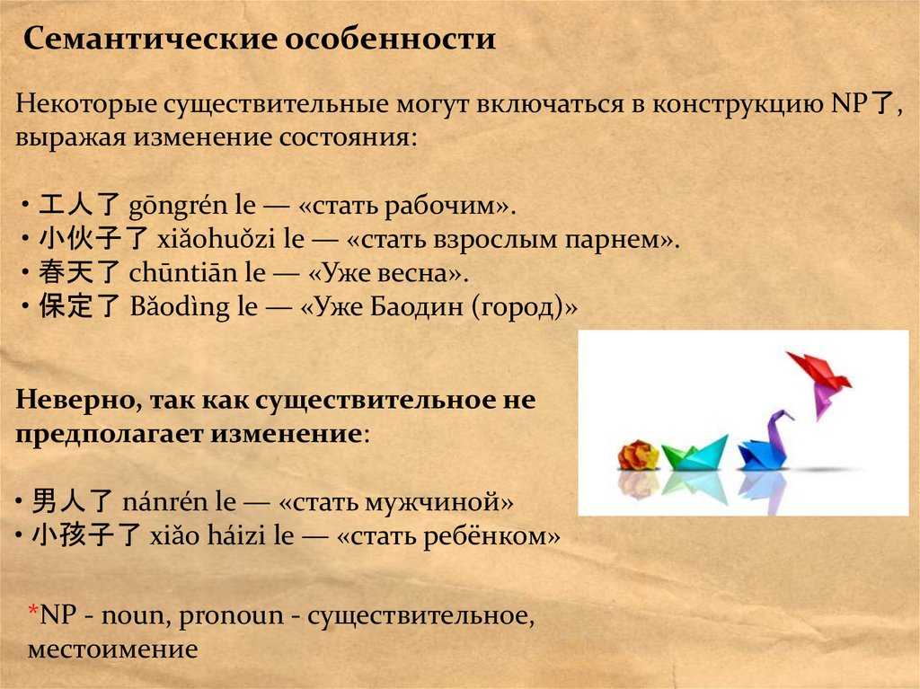 Семантические особенностиНекоторые существительные могут включаться в конструкцию NP了,