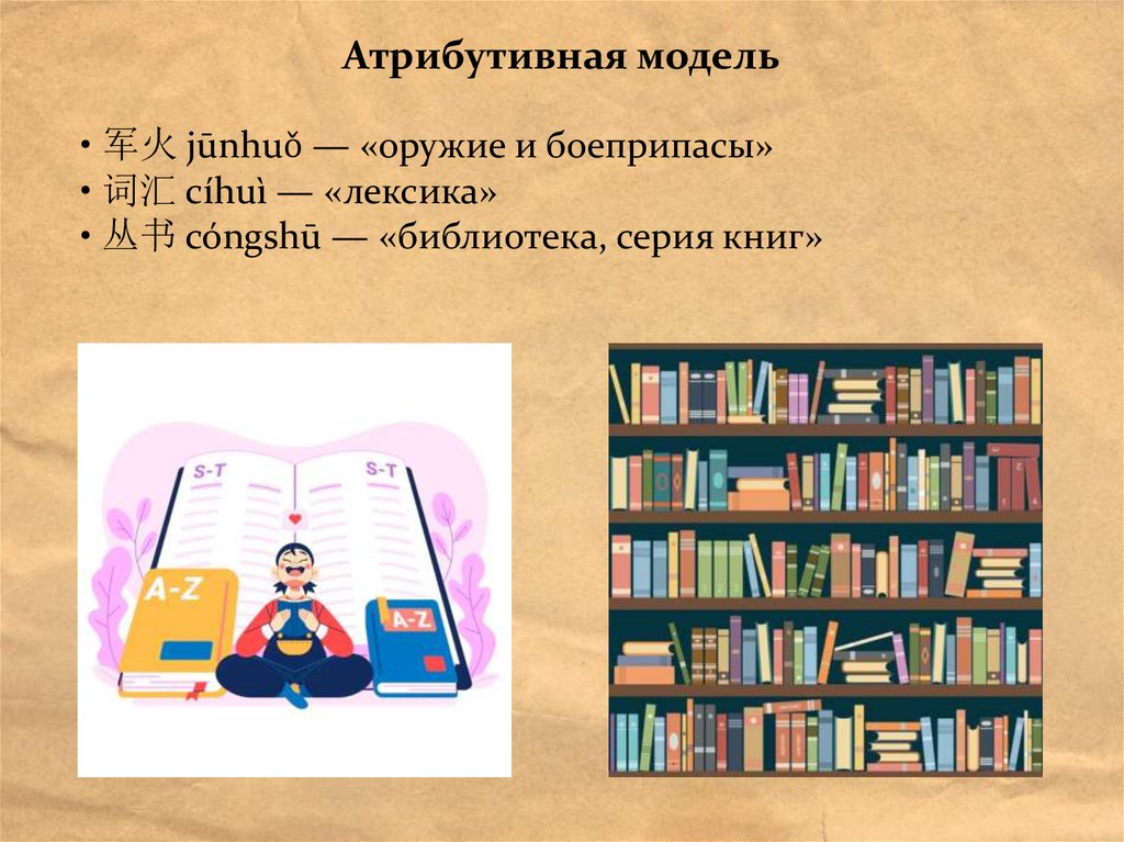 Атрибутивная модель• 军火 jūnhuǒ — «оружие и боеприпасы»