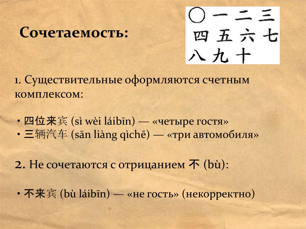 Сочетаемость:1. Существительные оформляются счетным