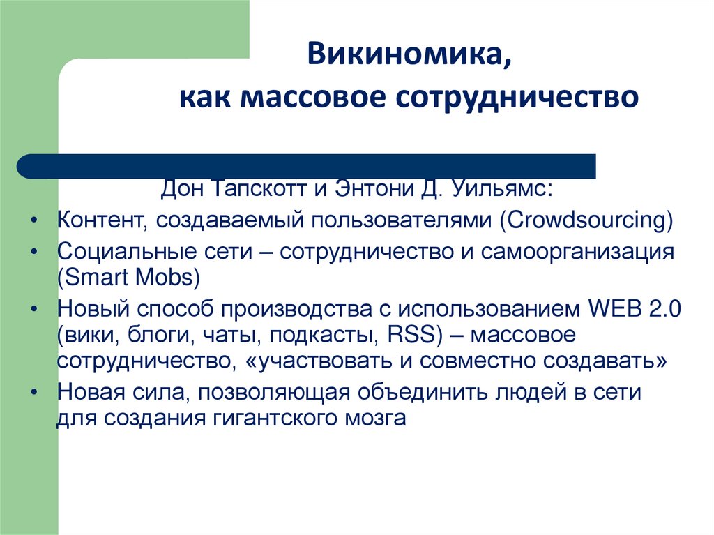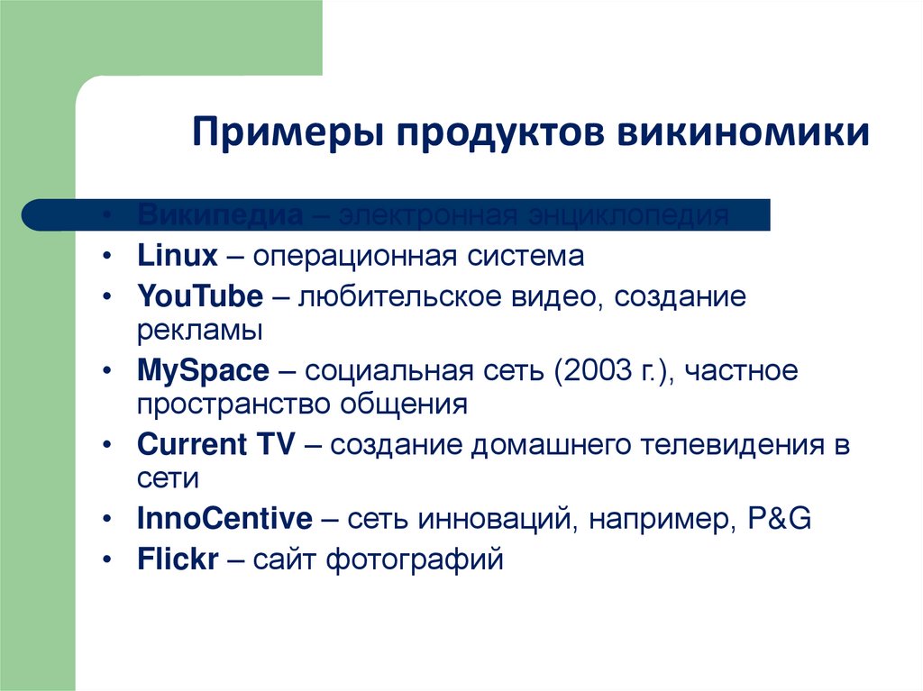 Примеры продуктов викиномики• Википедиа – электронная энциклопедия